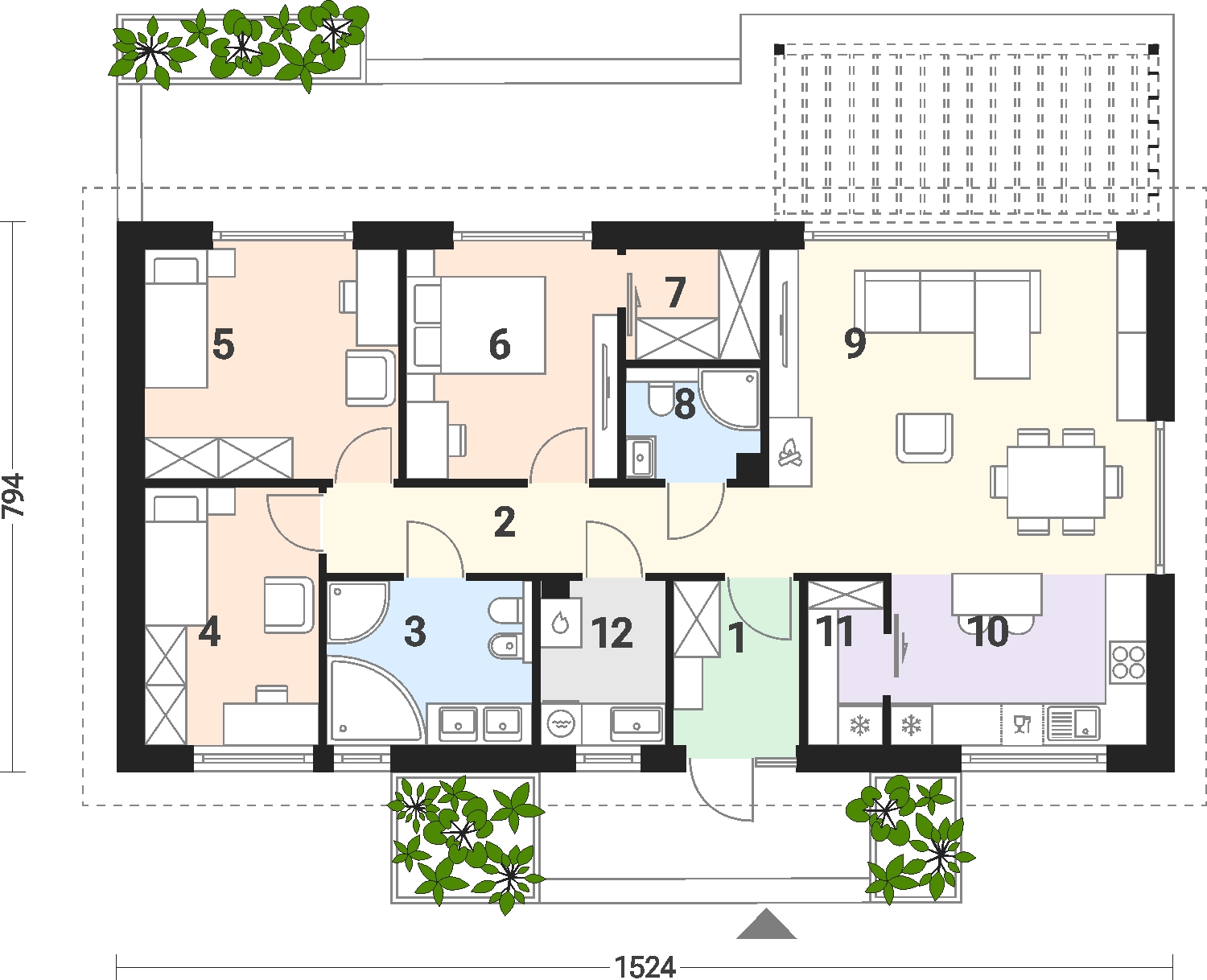 • Dach dwuspadowy o kącie nachylenia od 30 do 45 stopni (w zależności od projektu)